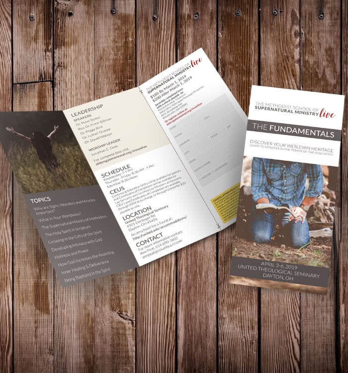 The client created a new event based on a series of older events that were on DVD. We needed to create new, modern branding that also highlighted that this was a live event. We created a new logo and then used a modern design style for their brochure. We took the client data and edited it and then organized it so that the final brochure was clean and bold but also easy to read. We also included a large, clean registration form that made registering by mail very easy. The client loved the end result and continues to get positive comments about the design of the brochure.
